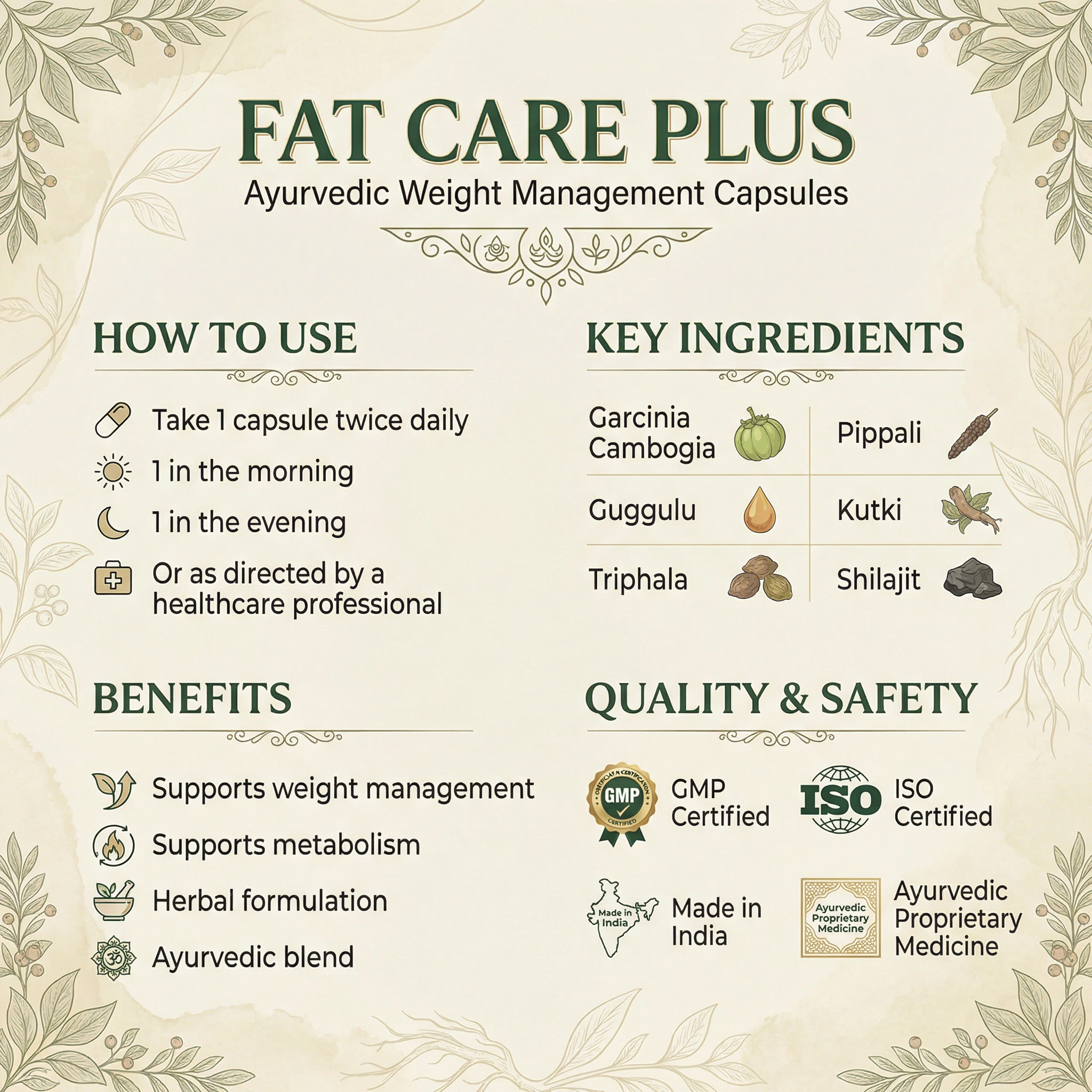 Fat Care Plus by Pure Cure Veda is an Ayurvedic herbal capsule formulation made with Garcinia Cambogia, Guggulu, Triphala, Pippali, Kutki and Shilajit. These traditional herbs are known in Ayurveda to support healthy metabolism, digestion and natural weight management as part of a balanced lifestyle.